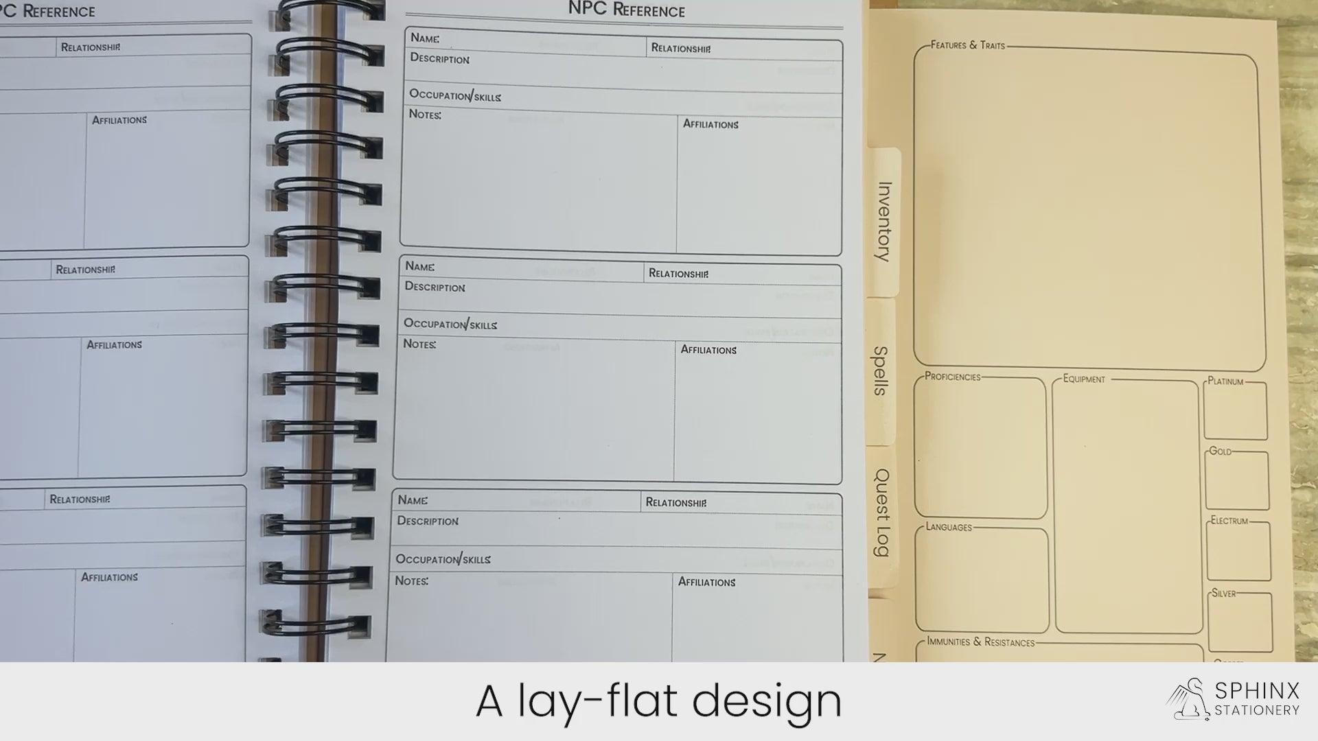 With its intuitive layout and carefully curated features including inside cover pockets, easy access dry/wet erase pen compatible character information flip outs, quick flip tab dividers and 230 specifically designed D&D pages, this notebook is perfect for capturing all of the details of you and your party's journey. From shops in cities to region specific resources- there will always be a spot to write it down.